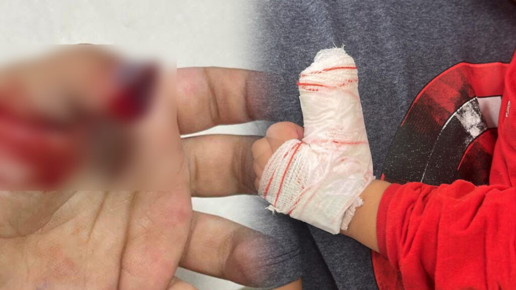A real dimensão do acidente só veio à tona quando o pai chegou à escola e, por chamada de vídeo, mostrou o estado do dedo do menino à mãe. “O dedo do nosso filho estava sangrando muito, com a ponta do dedão arrancada!”, relatou. A criança foi imediatamente levada ao hospital, recebeu anestesia, levou pontos e segue em tratamento, com curativos diários. A parte arrancada do dedo, segundo os pais, sequer foi localizada.