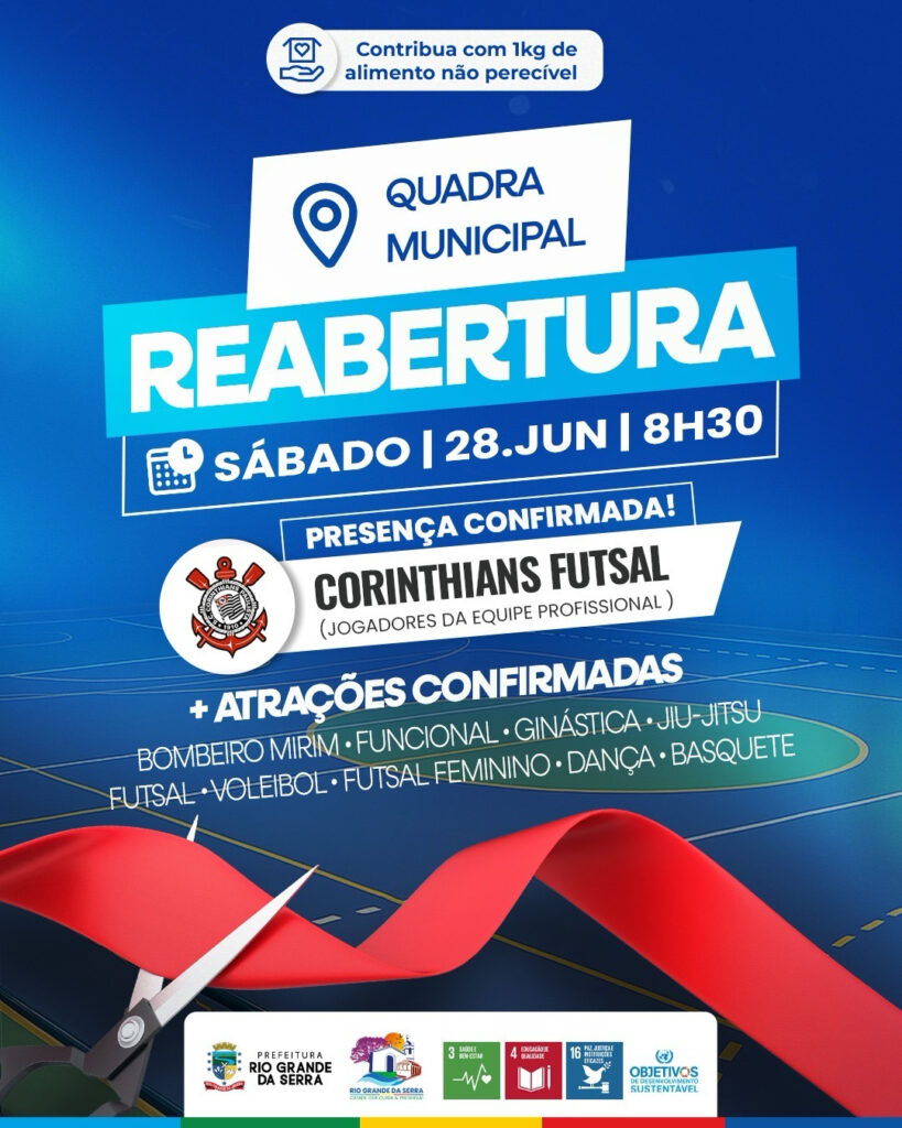 No próximo sábado, 28 de junho, a cidade de Rio Grande da Serra celebrará a tão aguardada reabertura da Quadra Municipal. O evento tem início às 8h30 e contará com a presença especial dos jogadores profissionais de futsal do Sport Club Corinthians Paulista, promovendo uma verdadeira festa para os amantes do esporte.