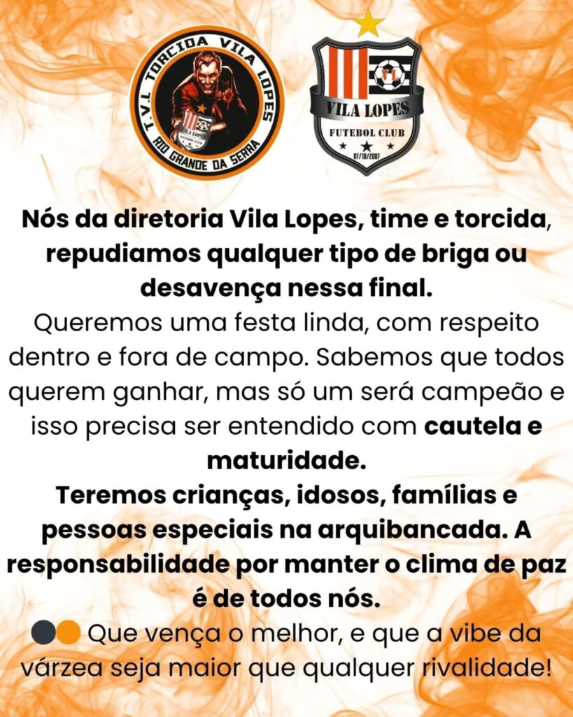 Preparem os corações, pintem os rostos de laranja e preto e separem as bandeiras! Neste domingo, às 10h, no Estádio Teixeirão, o Vila Lopes vai em busca de mais um capítulo glorioso da sua história na grande final do Campeonato Especial de Rio Grande da Serra 2025, contra a tradicional equipe do Vila Conde.