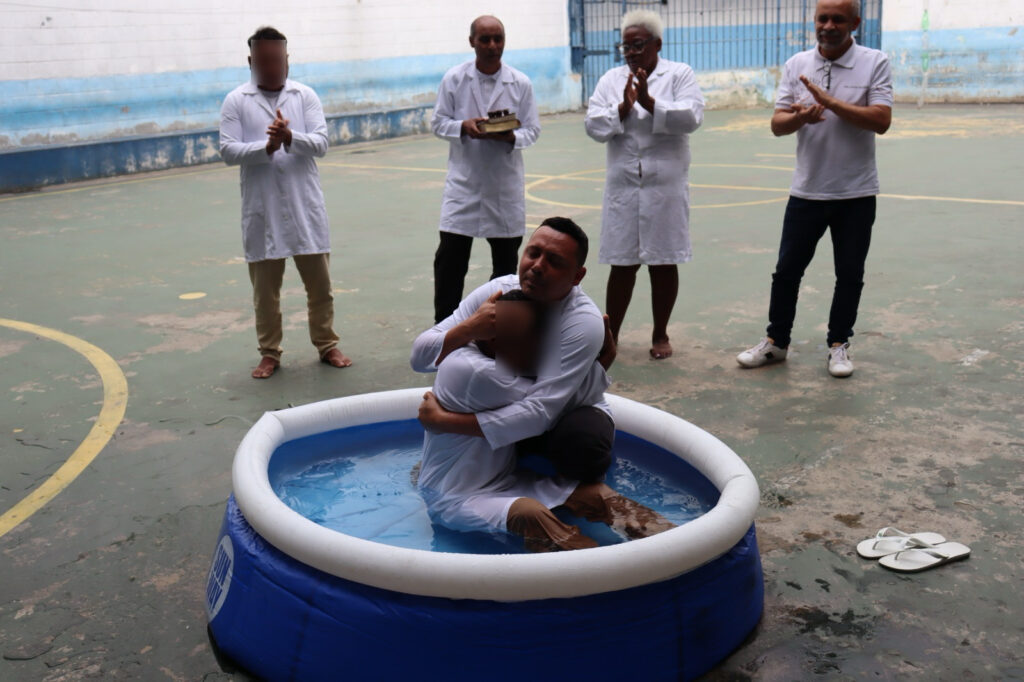 Um batismo sendo realizado dentro de uma unidade prisional, mostrando a transformação através da fé