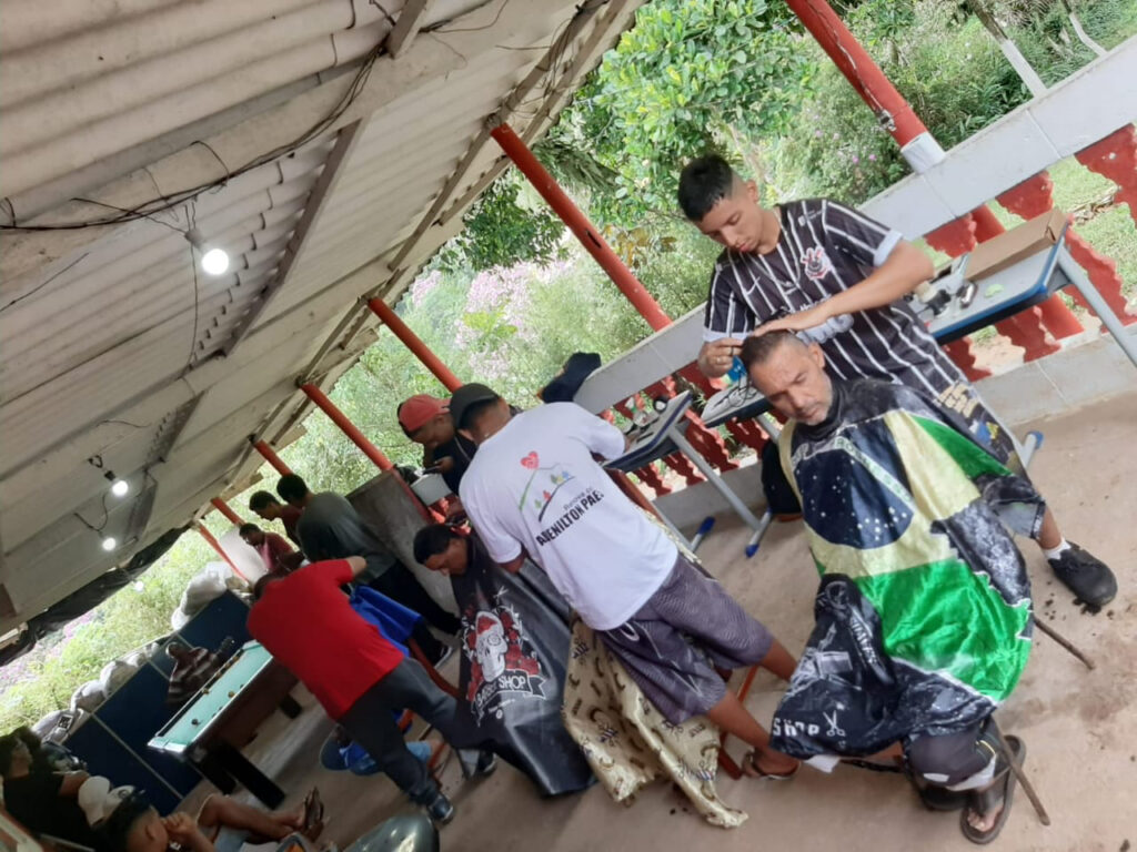 Um momento de confraternização e ação social em uma comunidade terapêutica, com voluntários e internos interagindo enquanto tem seus cabelos cortados