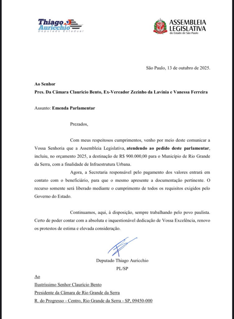RIO GRANDE DA SERRA – Uma notícia de peso acaba de chegar para Rio Grande da Serra: a cidade vai receber um reforço significativo de R$ 900 mil para investir na infraestrutura urbana a partir de 2025. Esse dinheiro, que chega na forma de uma emenda parlamentar, é resultado direto da parceria e do empenho do Deputado Estadual Thiago Auricchio (PL/SP) e de uma solicitação estratégica do vereador Clauricio Bento, que hoje preside a Câmara Municipal.