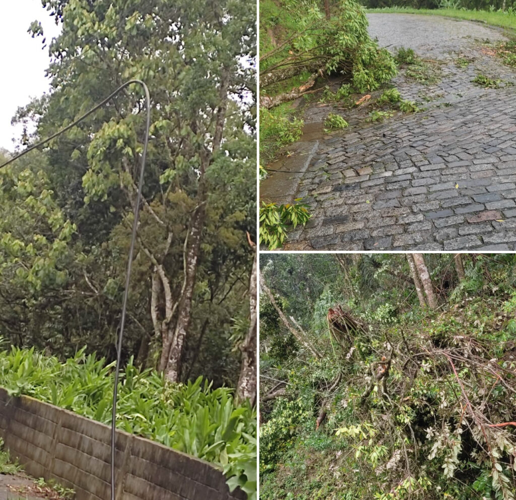 As imagens do amanhecer revelam o cenário: árvores gigantes derrubadas, bloqueando vias e caindo sobre propriedades.