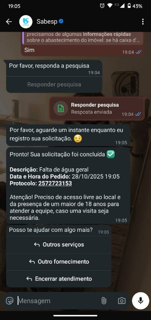 Diante do problema, os moradores buscam os canais oficiais. Em uma das tentativas de contato, um consumidor registrou a reclamação de “Falta de água geral” através de um aplicativo de mensagens. O sistema gerou um protocolo (2572723153) e deu a solicitação como concluída.