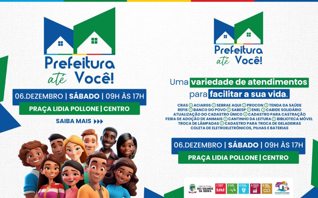 A Prefeitura de Rio Grande da Serra promove, no próximo sábado, 06 de dezembro, mais uma edição do programa “Prefeitura até Você”, um grande mutirão de serviços que leva atendimentos essenciais diretamente à comunidade. A ação será realizada das 9h às 17h, na Praça Lidia Pollone, no Centro.