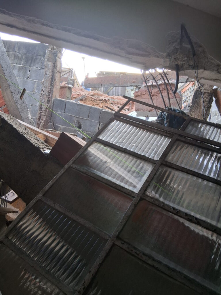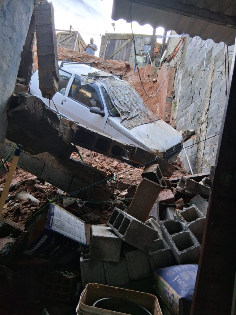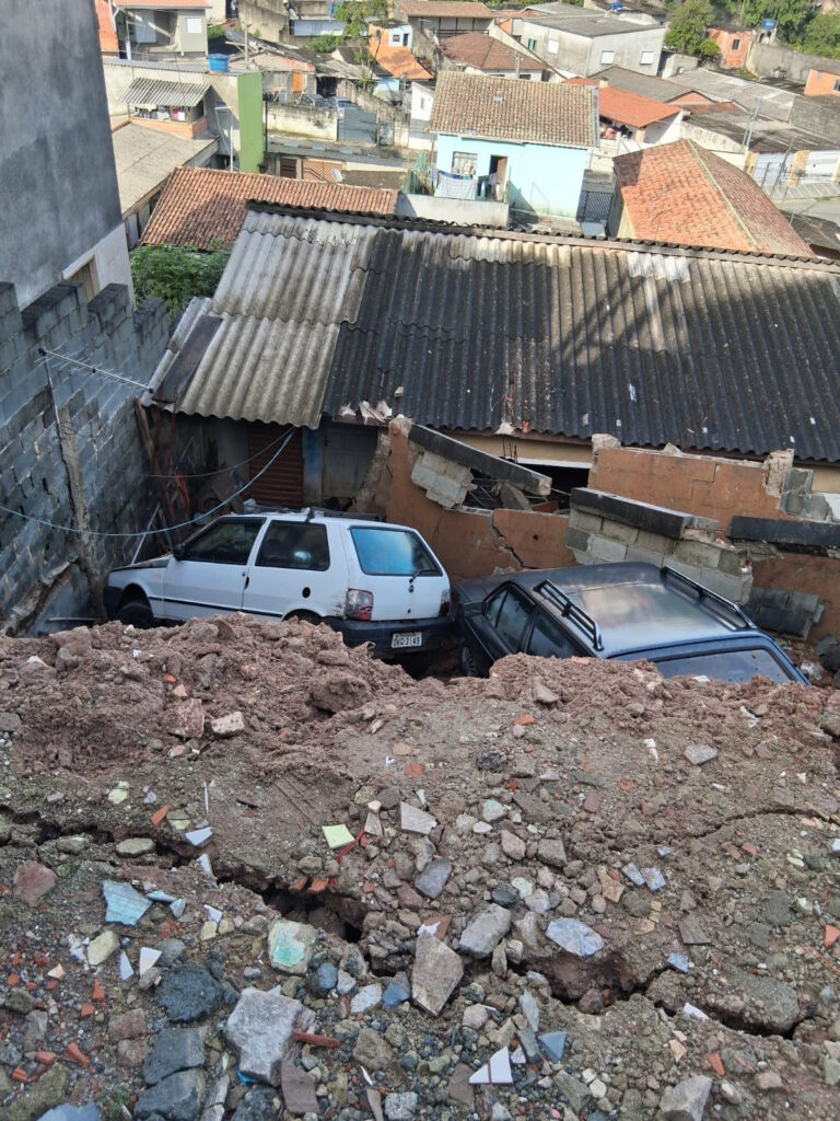 O caso de maior gravidade aconteceu na Rua Cambauva, número 150, na Vila Arnold. No local, a estrutura de uma garagem cedeu completamente, fazendo com que dois veículos caíssem sobre o imóvel localizado no nível inferior do terreno. As imagens do desmoronamento mostram os carros, um branco e outro de cor escura, parcialmente soterrados e escorados em meio aos escombros, com risco iminente de invadir totalmente a residência.