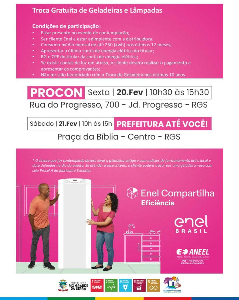 Entre os destaques está o cadastro para troca gratuita de geladeiras e troca de lâmpadas, por meio do programa Enel Compartilha Eficiência. Também haverá cadastro para o Programa Reserva Certa (SABESP), que prevê instalação gratuita de caixa d’água e tarifa social com até 50% de desconto na conta de água e esgoto para famílias de baixa renda.