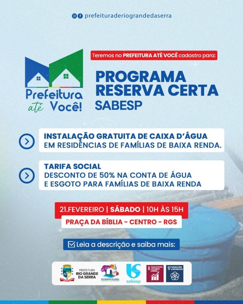 A Prefeitura de Rio Grande da Serra promove neste sábado, 21 de fevereiro, das 10h às 15h, na Praça da Bíblia – Centro, mais uma edição do programa “Prefeitura até Você”, reunindo diversos serviços públicos em um único local para facilitar o atendimento à população.
