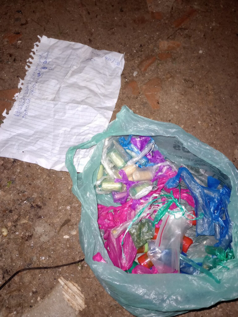 A apreensão inclui centenas de porções de drogas, acondicionadas em embalagens individuais de diferentes cores, indicando possível distribuição para venda no varejo. Junto aos entorpecentes, foi encontrado um papel com anotações que parecem corresponder a registros de controle de estoque ou transações relacionadas às substâncias apreendidas.